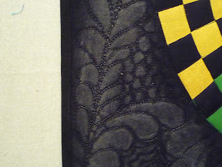 The shading in the center circles was done with Tsukenieko inks, and pastels. I also used some varigated thread - which I was planning to quilt the whole thing with. The incessant breakage made me abandon that for the solid black thread which seemed a bit more stable. Even though that would break frequently as well.