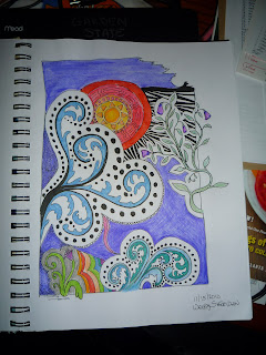The next day, I did this one with pen and watercolor pencils that I "activated" with water and a brush- the paper's not watercolor paper, so the results were a little "bumpy". However, I really like the black blue and white shapes (with the dots) and that might morph into an actual fabric design down the road.